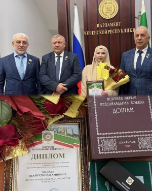 Почетная грамота Алабаевой Айшат Асламбековне За добросовестное и безупречное исполнение служебных обязанностей, высокие показатели в работе, за активное участие в проведении общественных мероприятий в Ахматовском районе г. Грозного.