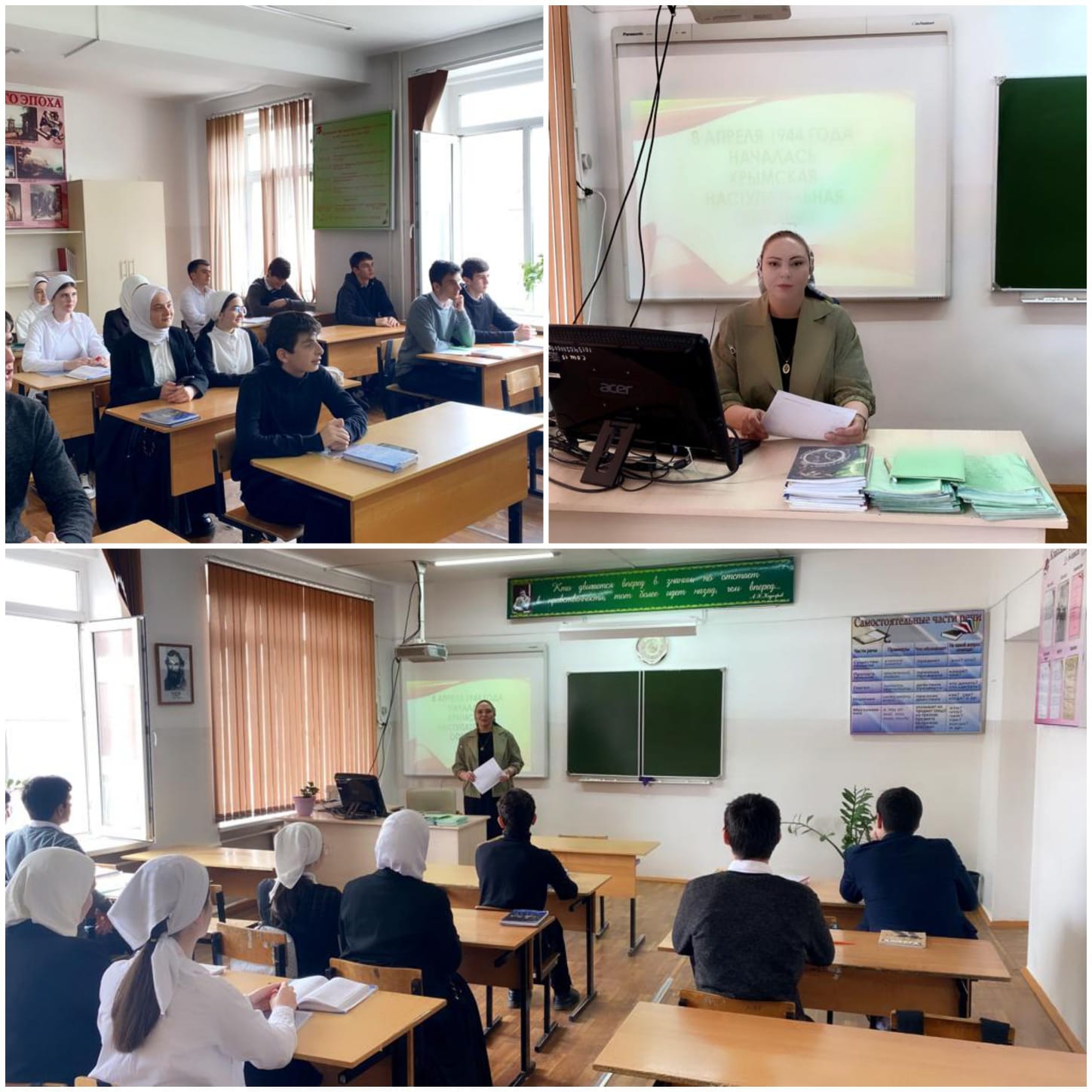 08.04.2022Научный сотрудник Мемориального комплекса Славы имени А.А.Кадырова Муцаева Хава Ильясовна провела в нашей школе урок истории на тему: "Крымская стратегическая наступательная операция 1944г."