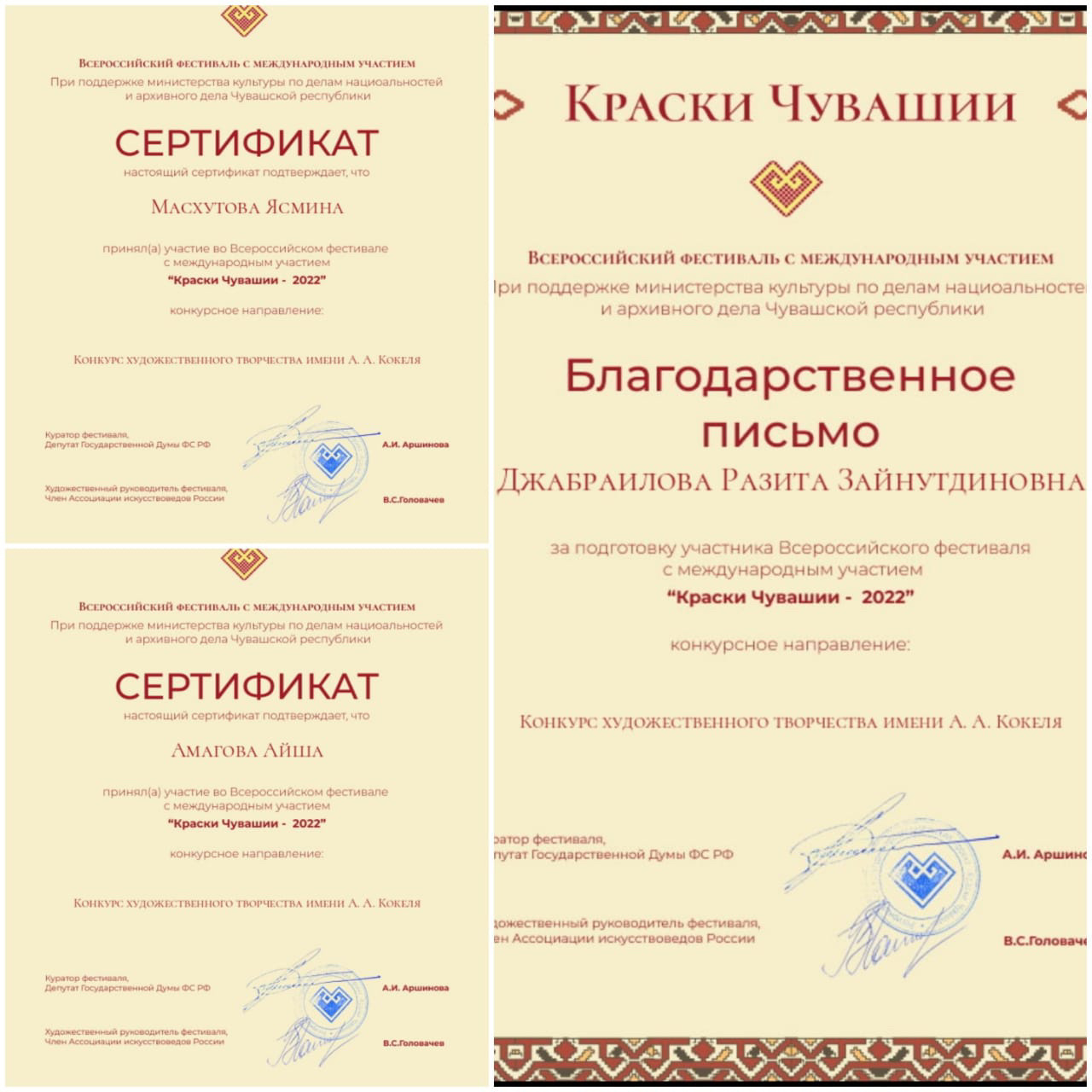 Сертификаты за участие в Всероссийском фестивале «Краски Чувашии-2022».