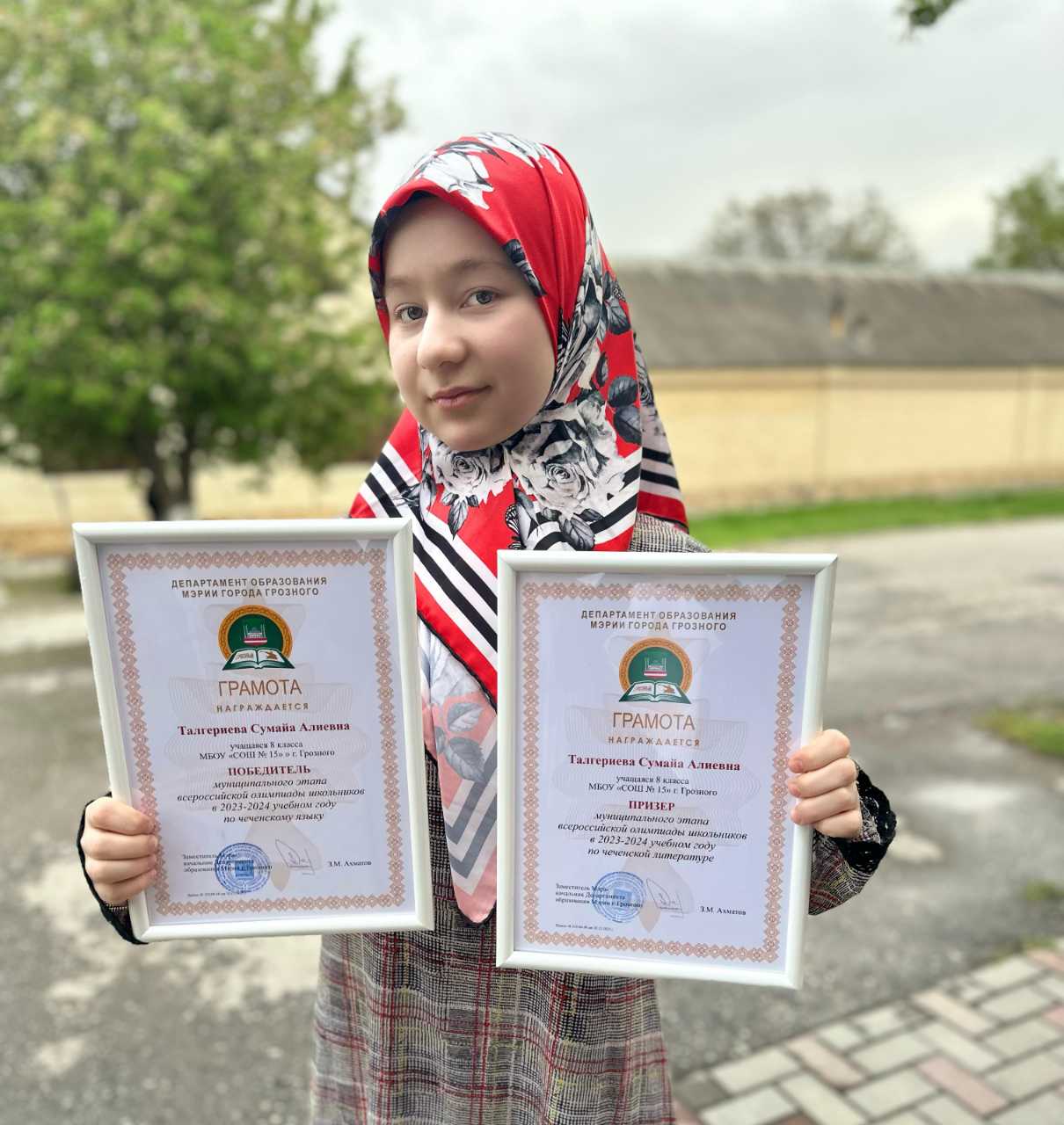 Заместитель директора по методической работе Исламханова Х.А. организовала возможность для учащихся 5-8 классов участвовать в олимпиаде по предметным областям. Основной задачей данного мероприятия было привитие интереса к своей участия в олимпиадах по разным направлениям. Участвовали все школы города Грозного. МБОУ «СОШ №15» представляли 10 учащихся разных классов. Первое место в муниципальном этапе по знаниям родного языка и литературы заняла Талгериева Сумайа Алиевна, ученица 8 «Г» класса. Для Сумайи эта победа была очень важна, так как очень долго готовилась именно по этим предметам. Любовь к родной истории, литературе, языку ей привила ее учительница, Патаева З.А., которой она выразила свою любовь и уважение. Для нее эта была еще одна большая победа в ее копилку. Сумайа участвует почти во всех мероприятиях школы и всегда занимает призовые места. Родители Сумайи выражали огромную благодарность школе за внимание, знания, которые получили их дети.