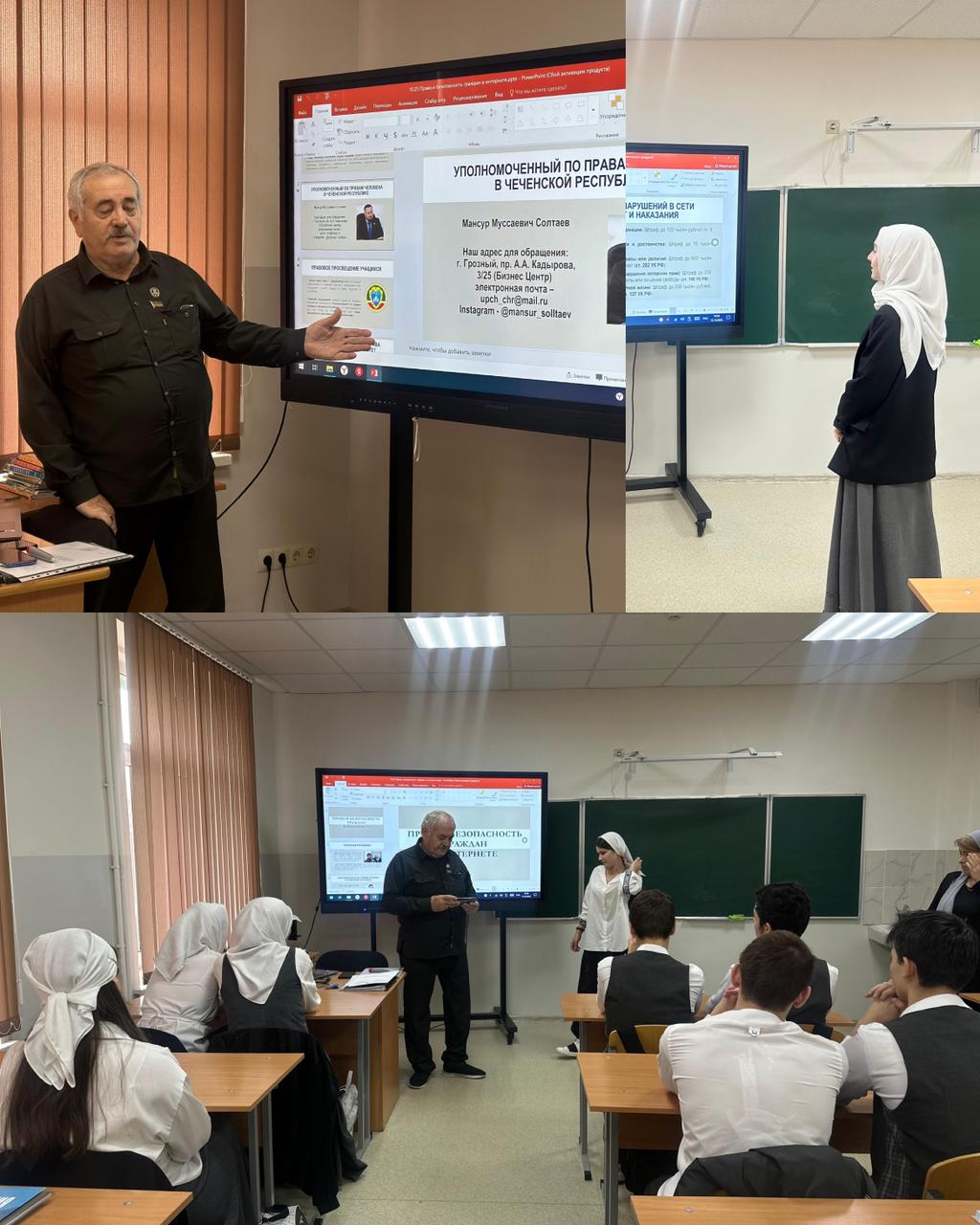 Муцаев Мамий Увайсович, советник уполномоченного по правам человека в ЧР, провел урок на тему «Права и безопасность граждан в интернете». Главная цель заключается в формировании у учащихся понимания важности соблюдения прав и защиты личной информации в сети Интернет, развитии навыков безопасного поведения онлайн и осознании возможных рисков виртуального пространства.