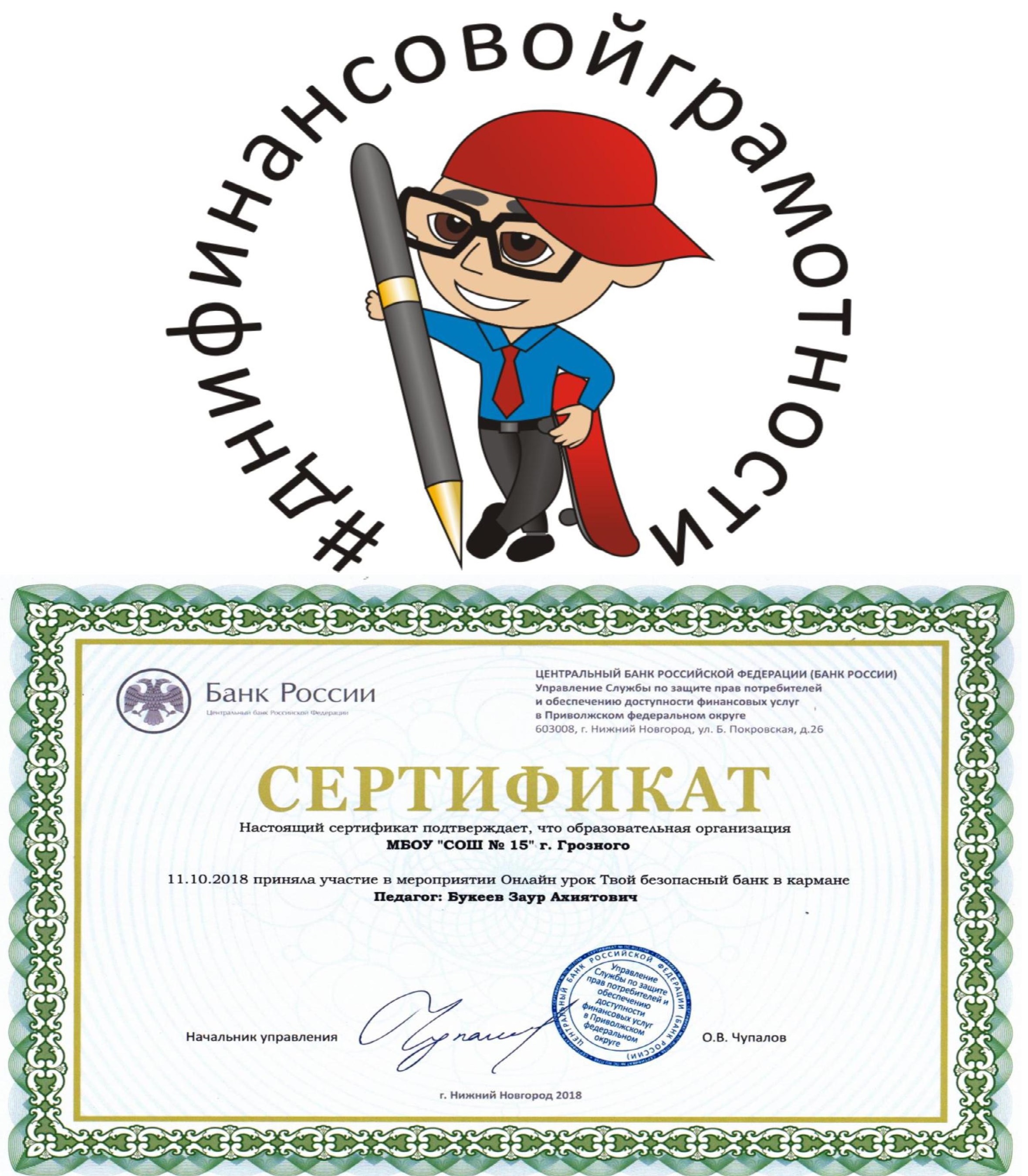 МБОУ «СОШ № 15» г. Грозного с 18 сентября проводятся уроки финансовой грамотности. Администрацией школы поставлена задача пройти всю программу проекта «Онлайн уроки финансовой грамотности. Профессионалы финансового рынка придут в каждую школу» до 18 декабря 2018 г.